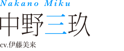 五つ子の三女。 ミステリアスで大人しい性格だが、 内に秘めた思いを持っている。 他の姉妹の変装が得意で、 たまに他の姉妹のフリを頼まれる。 戦国武将が好きな歴女。