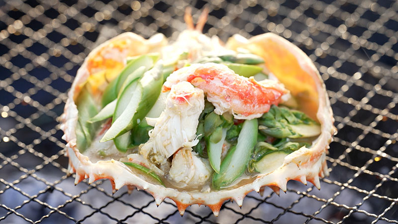 極太アスパラとタラバガニの甲羅焼き
