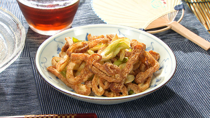 1.5mm幅にカットした油揚げをサラダ油でカリカリになるまで炒める