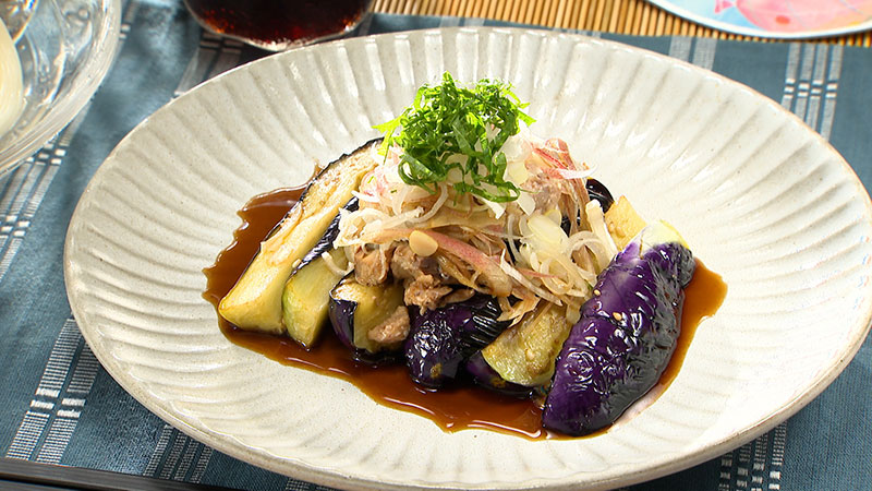 1. ナスはヘタを切り落として縦1/4に切り、皮に切り込みを入れ素揚げにする。
