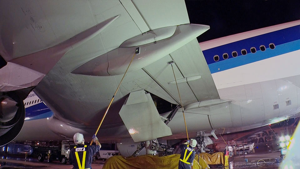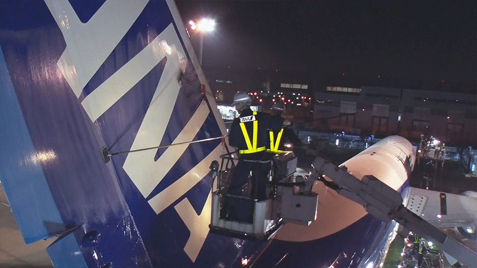羽田空港では迫力ある飛行機の清掃が。飛行機は“精密機器の結晶”のため、清掃は機械を使わず、全て丁寧な手作業です。