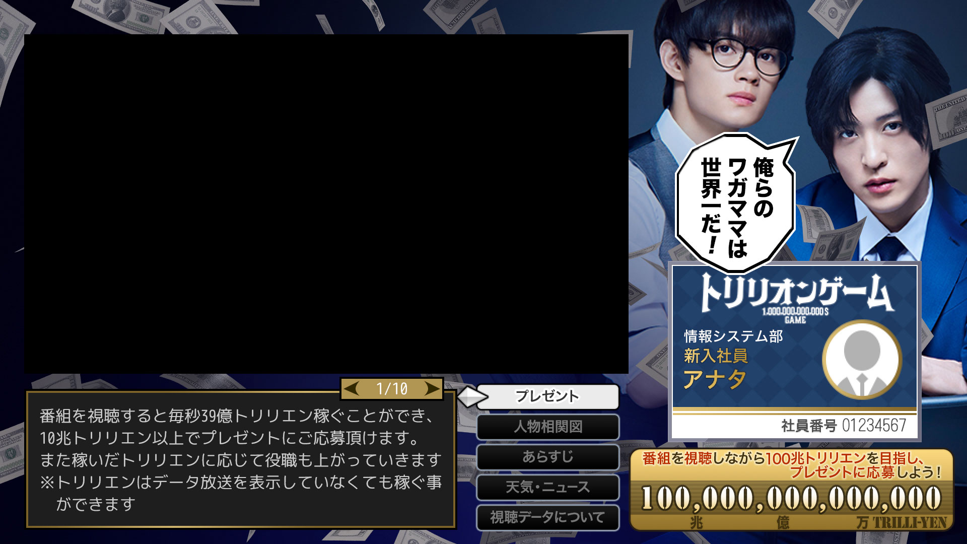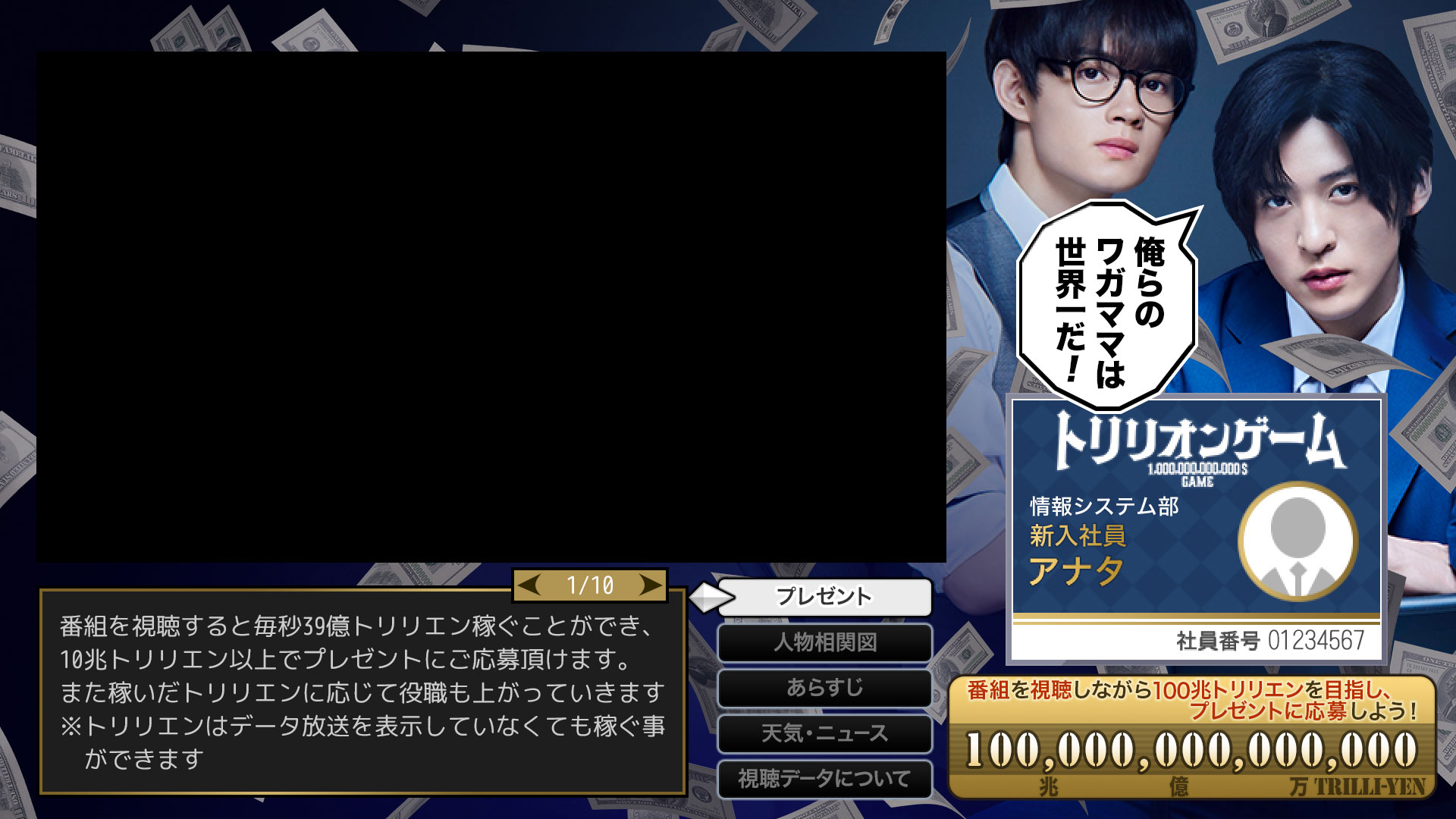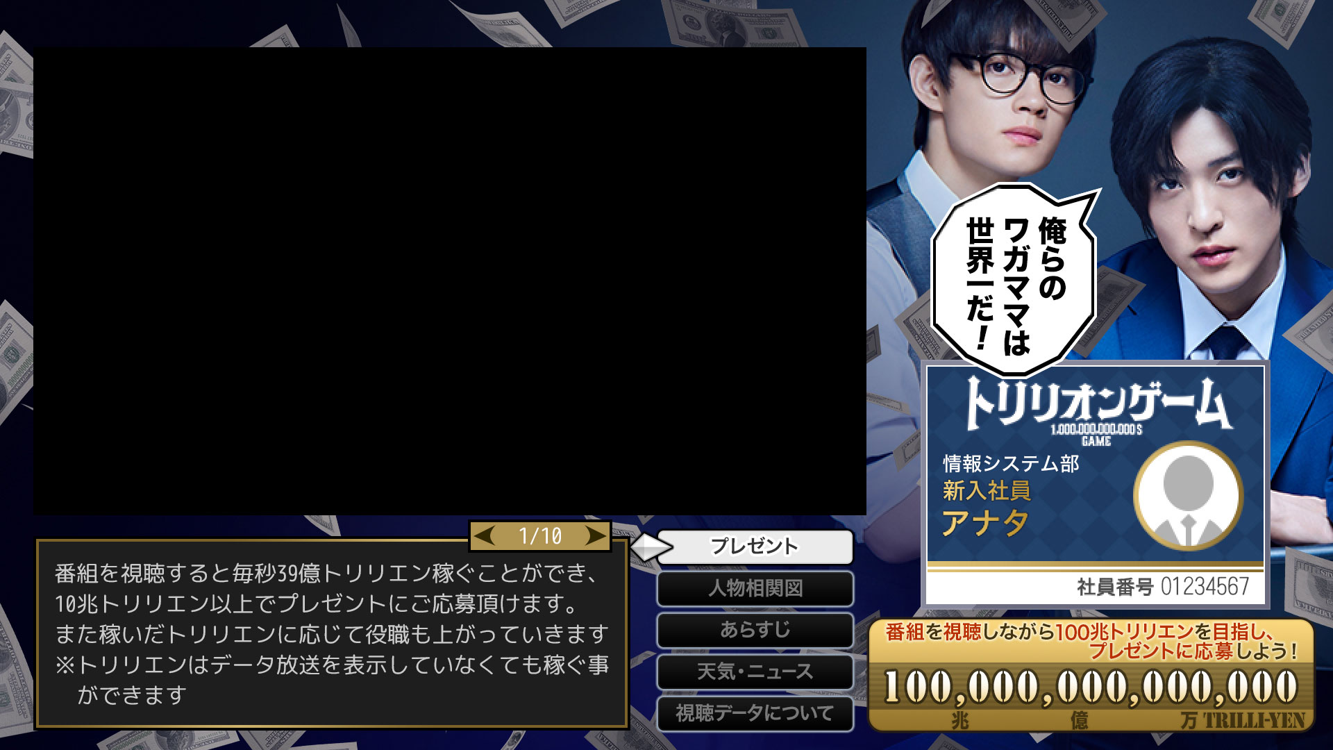 株式会社トリリオンゲームの社員としてデータ放送に参加し、「トリリエン」を稼いで、役職ランクアップを目指してください。